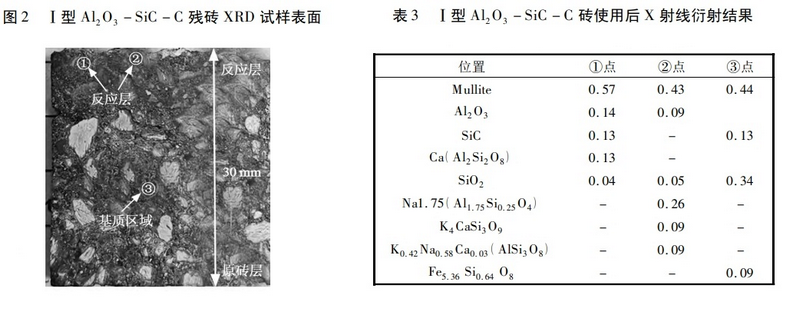 在反應面的位置,①點區(qū)域物相以正常的莫來石、Al2O3、SiC 為主,出現(xiàn)部分鈣長石 Ca( Al2 Si2 O8 ) ; ②點區(qū)域仍以莫來石為主,出現(xiàn)了大量硅酸鋁鈉Na1.75 ( Al1.75 Si0.25O4 ) 、鉀長石/鈉長石 K0.42Na0.58Ca0.03( AlSi3O8) 和硅酸鉀/硅酸鈣( K4CaSi3O9)等系列受渣侵所產(chǎn)生的物相,這些物相一般熔點都不高于1 300 ℃。①點和②點區(qū)域幾乎沒有原始物相SiC和SiO2的存在,說明SiC和SiO2在反應層幾乎被反應殆盡。原磚基質(zhì)部位的物相為莫來石、SiO2、SiC及少量的氧化硅鐵( Fe5.36 Si0.64 O8 )。